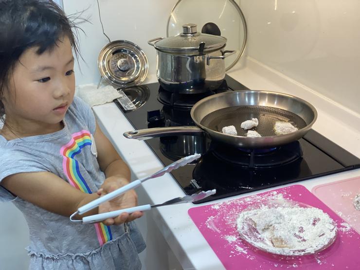四歲小童學煎魚排,這裡也是此一企劃的問題意識發生地